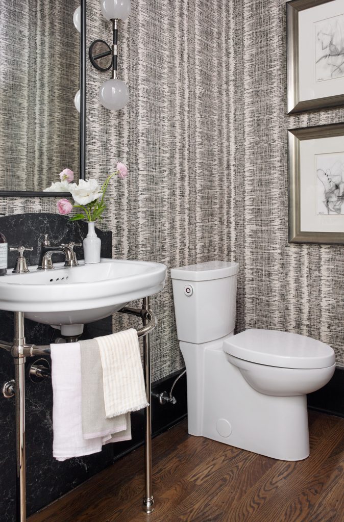 Create a primping room fit for a Hollywood A-lister by using some surprisingly simple décor essentials: a classic vanity, glamorous chandelier, and patterned walls. The result? A bathroom with a touch of flair, lots of style, and a slight air of drama. We love it!