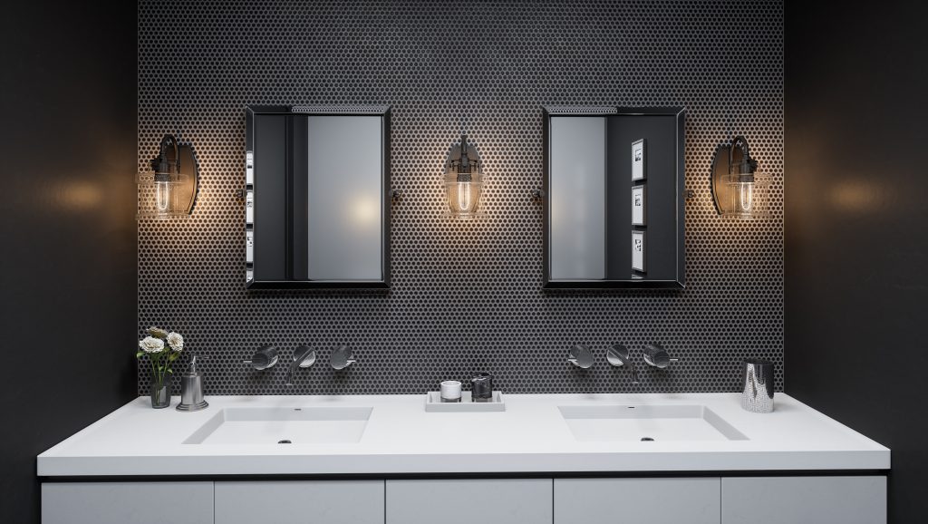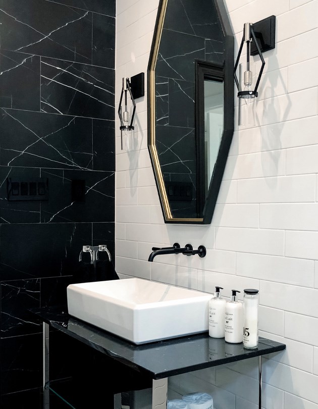 In this bathroom, diamonds are everyone’s best friend. Flanking the mirror with unusual diamond-shaped light fixtures creates a distinctive, fashionable element, making this space seem subtly one-of-a-kind.