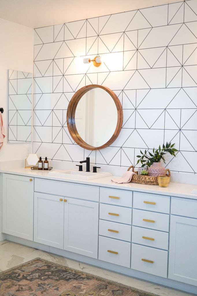 This bathroom uses a brilliant geometric design as a wall accent, then simplifies the space with a clean-cut, over-the-mirror light fixture in a pretty accent color. The result is an engaging, but not overly busy, bathroom look.