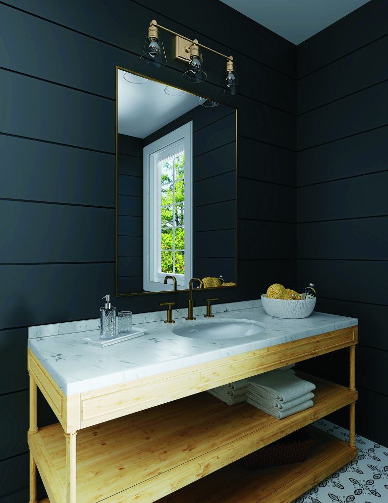 Coloring with contrasts make for a striking match with any vanity set. A simple, yet functional brass light fixture ties the whole look together, while still providing the bright light you need to get ready every morning.