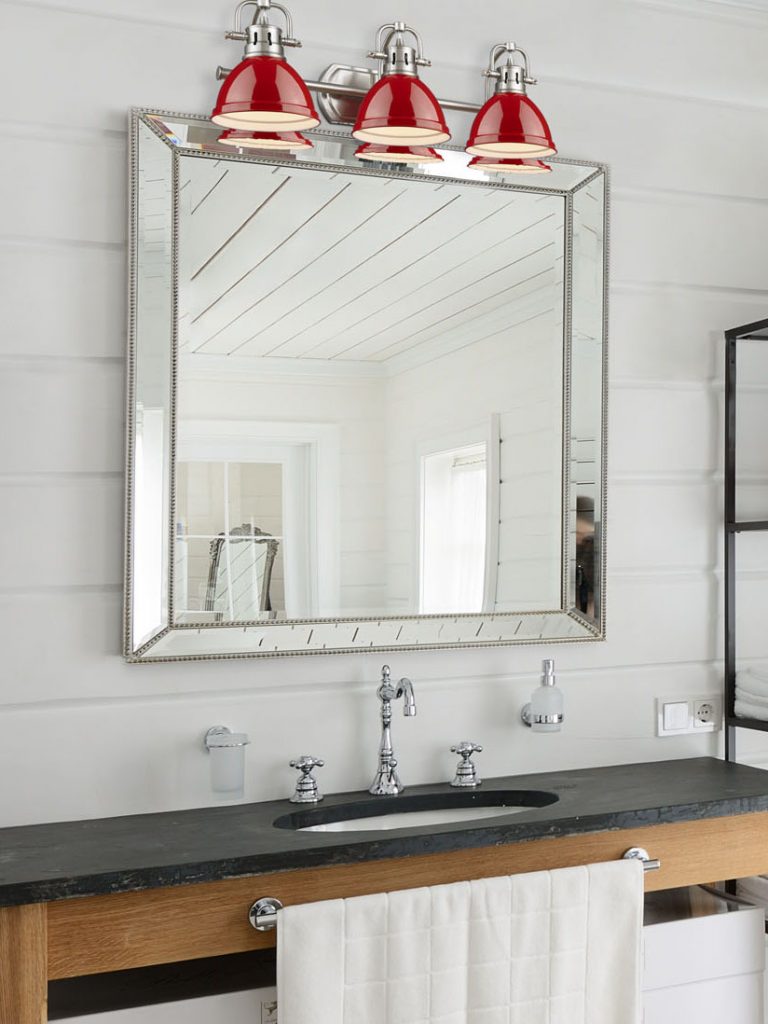 If you want a pop of color in your bathroom, but you aren’t willing to commit to a full accent wall, try colorful light fixtures! These red lights are a bright spot in a white room that draw attention and add style without being overwhelming.