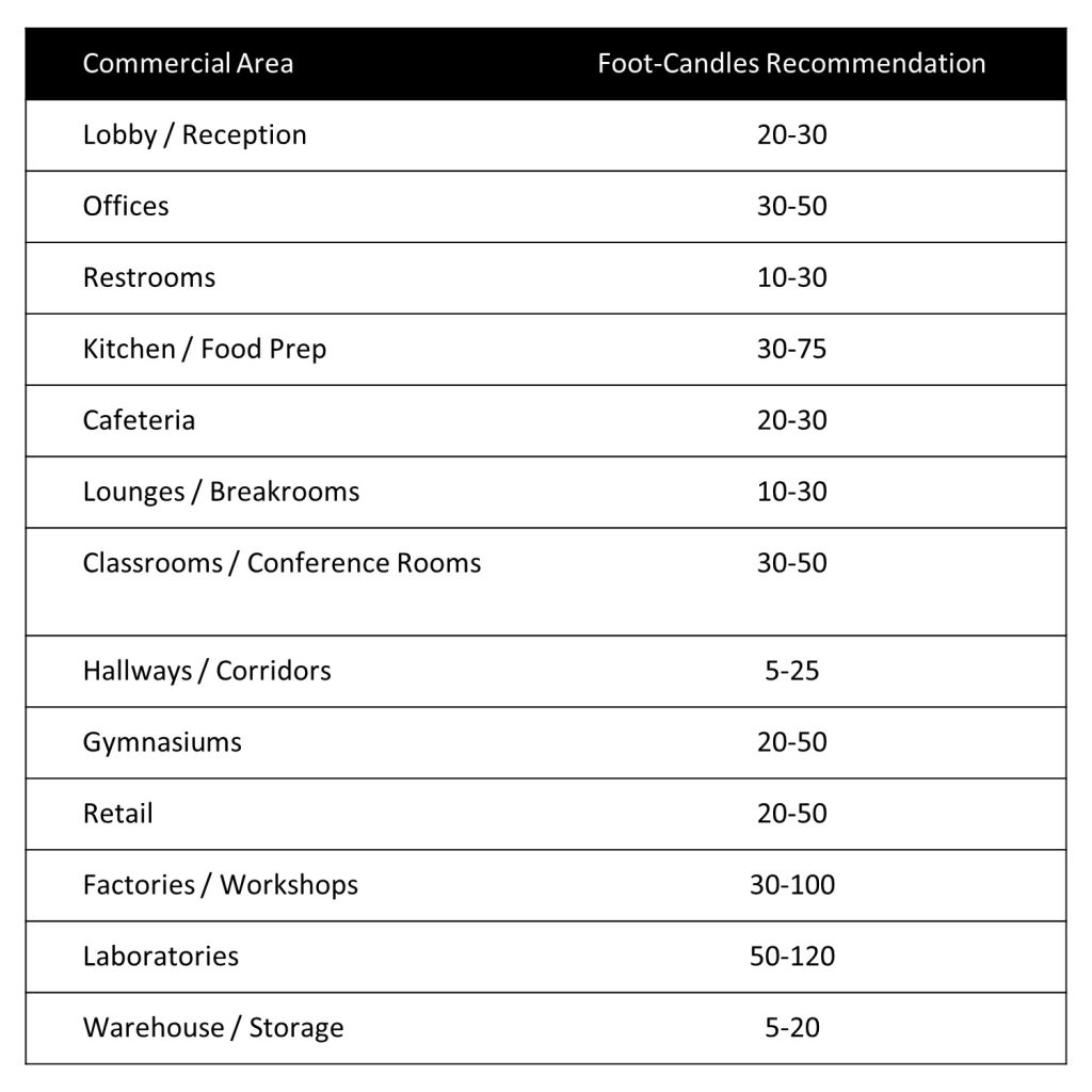 Light recommendations for commercial spaces are given in foot-candles, which is a measure of the intensity of light. If you were to hang a single bulb in a room and measure foot-candles throughout the space, you’d find that the foot-candles are the highest directly under the bulb. You can even out light coverage and increase the overall intensity of the lighting by spreading several lights out across a space.