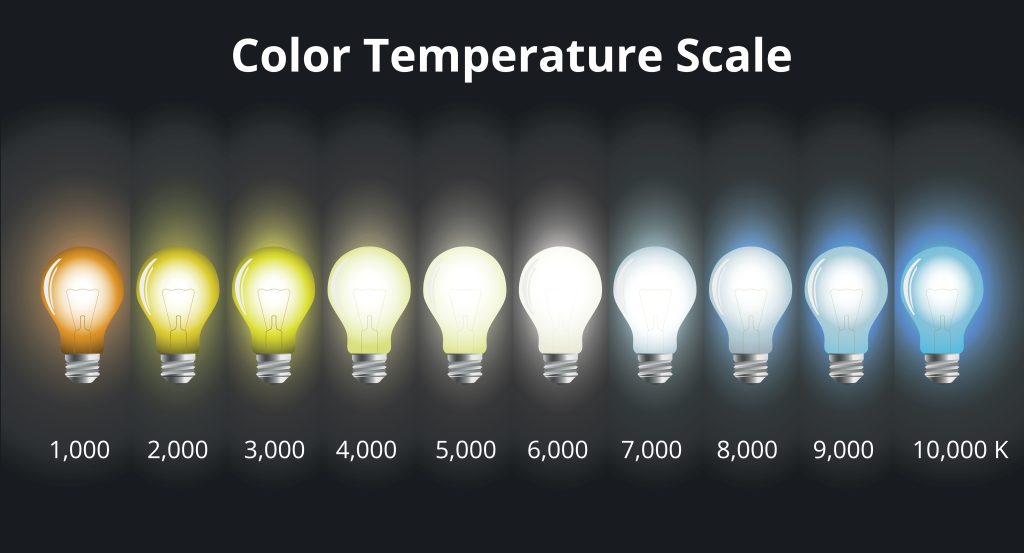 Light bulbs come in colors measured in Kelvins, ranging from warm white (usually around 2700K) to cool light (usually around 5000K). The color of natural light changes throughout the day, and humans have adapted to react to the change. The color of the light in your home can have a direct impact on the mood of the people that are in it. Warm light is relaxing, while cool light is energizing.