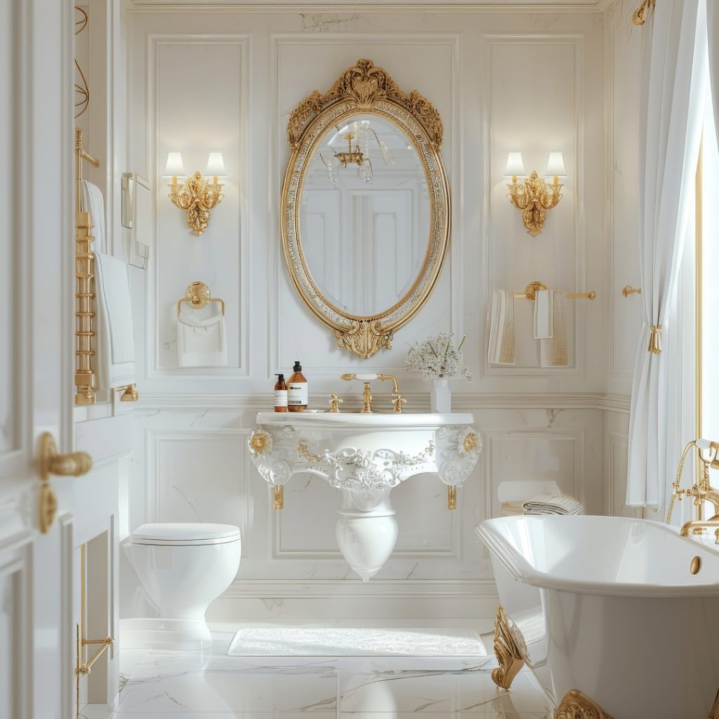 When more was more, the 1870s was a period full of ornate designs and a whole lot of gold. While you may choose not to go as maximalist as some of the fashionable folks of this period, oversized mirrors, sumptuous linens, and gold and glass fixtures make for a truly luxe lavatory.